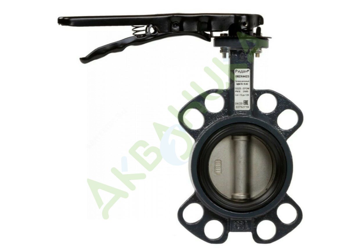 Затвор дисковый поворотный чугун ЗДМ 05 Ду 80 Ру16 межфл с рукояткой диск нерж манжета EPDM Ридан